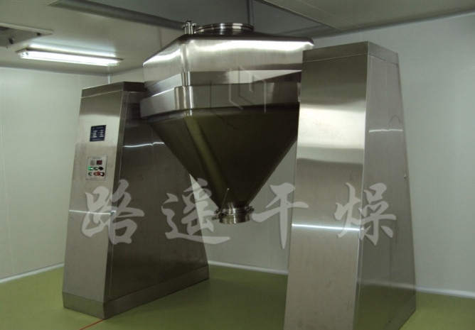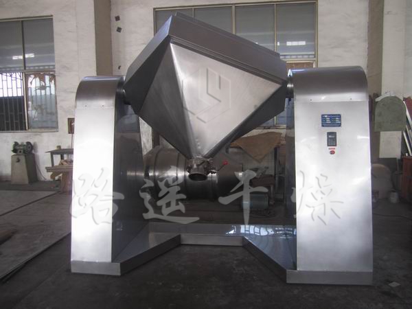 將物料裝入方錐形密閉混合桶內(nèi),料斗對(duì)稱的軸線與回轉(zhuǎn)軸軸線成一夾角,不同組分物料在密閉的料斗中進(jìn)行三維空間運(yùn)動(dòng),產(chǎn)生強(qiáng)烈翻轉(zhuǎn)和擴(kuò)散收縮作用,達(dá)到混合效果。