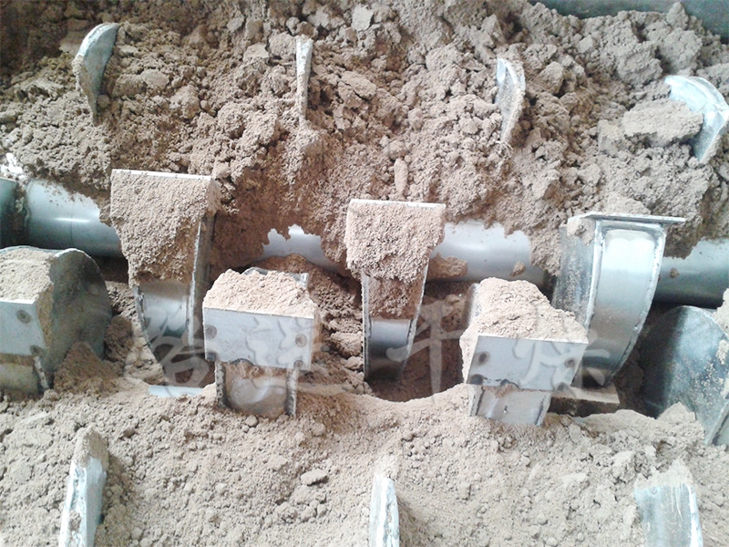 ??污泥由給料機(jī)經(jīng)溜槽進(jìn)入烘干機(jī)內(nèi)導(dǎo)料板上,隨著筒體的轉(zhuǎn)動(dòng),污泥被導(dǎo)至傾斜揚(yáng)料板上即被提升到筒體的中心位置,逐漸灑落形成料幕,高溫氣流從中穿過(guò),使污泥預(yù)熱并蒸發(fā)部分水分。當(dāng)污泥灑落、移動(dòng)到活動(dòng)的篦條式翼板上時(shí),物料又與預(yù)熱過(guò)的篦條式翼板夾雜在一起,將熱量傳給物料,使部分水分蒸發(fā)。同時(shí),翼板夾帶物料提起、灑落,重復(fù)多次,物料與熱氣流進(jìn)行對(duì)流和接觸熱交換。同時(shí)埋在物料中的清掃裝置,也沿圓弧形揚(yáng)料板的里側(cè)下滑,把揚(yáng)料板內(nèi)壁粘附的物料清掃下來(lái)。當(dāng)清掃裝置隨筒體轉(zhuǎn)過(guò)垂直線以后,又在圓弧揚(yáng)料板背面拖動(dòng),將其粘附在揚(yáng)料板外壁的物料清掃下來(lái)。隨著筒體的不斷轉(zhuǎn)動(dòng),使部分水分蒸發(fā),污泥得到進(jìn)一步干燥。同時(shí),清掃裝置對(duì)污泥團(tuán)球也起到了打碎作用,提高了干燥速度,后污泥干燥后變成低水分的松散物料,由出料口排出。