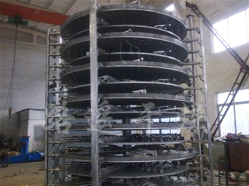 濕物料自加料器連續(xù)地加到干燥器上部第一層干燥盤上,帶有耙葉的耙臂作回轉運動使耙臂作回轉運動使耙葉連續(xù)地翻抄物料。物料沿指數螺旋線流過干燥盤表面,在小干燥盤上的物料被移送到外緣,并在外緣落到下方的大干燥盤外緣,在大干盤上物料向里移動并從中間落料口落如下一層小干燥盤中。大小干燥盤上下交替排列,物料得以連續(xù)地流過整個干燥器。中空的干燥盤內通入加熱介質,加熱介質形式有飽和蒸汽、熱水和導熱油,加熱介質由干燥盤的一端進入,從另一端導出。已干物料從后一層干燥盤落到殼體的底層,后被耙葉移送到出料口排出。濕份從物料中逸出,由設在頂蓋上的排濕口排出,真空型盤式干燥器的濕氣由設在頂蓋上的真空泵口排出。從底層排出的干物料可直接包裝。通過配加翅片加熱器、溶劑回收冷凝器、袋式除塵器、干料返混機構、引風機等輔機,可提高其干燥的生產能力,干燥膏糊狀和熱敏性物