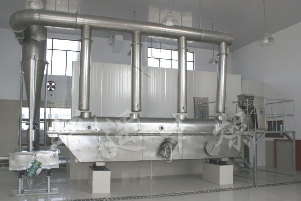 物料自進(jìn)料口進(jìn)入機內(nèi), 在振動力作用下, 物料沿水平方向拋擲向前連續(xù)運動,熱風(fēng)向上穿過流化床同濕料換熱后, 濕空氣經(jīng)旋風(fēng)分離器除塵后由排風(fēng)口排出, 干燥物料由排料口排出。