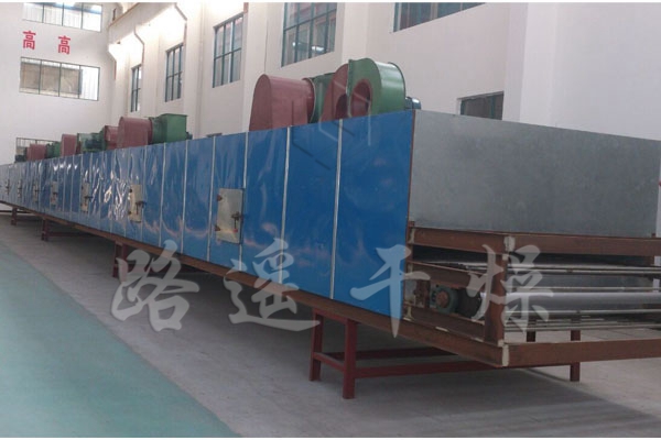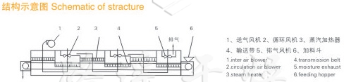 物料由加料器均勻地鋪在網(wǎng)帶上,網(wǎng)帶一般采用12-60目不銹鋼絲網(wǎng),由傳動(dòng)裝置拖動(dòng)在干燥機(jī)內(nèi)移動(dòng)。干燥機(jī)由若干單元組成,每一單元熱風(fēng)獨(dú)立循環(huán),部分尾氣由專門排濕風(fēng)機(jī)排出,廢氣由調(diào)節(jié)閥控制,熱氣由下往上或由上往下穿過鋪滿物料的網(wǎng)帶完成熱量與質(zhì)量傳遞的進(jìn)程,帶走物料水份。網(wǎng)帶緩慢移動(dòng),運(yùn)行速度可根據(jù)物料溫度自由調(diào)節(jié),干燥后的成品連續(xù)落入收料器中。上下循環(huán)單元根據(jù)用戶需要可靈活配備,單元數(shù)量亦可根據(jù)需要選取。